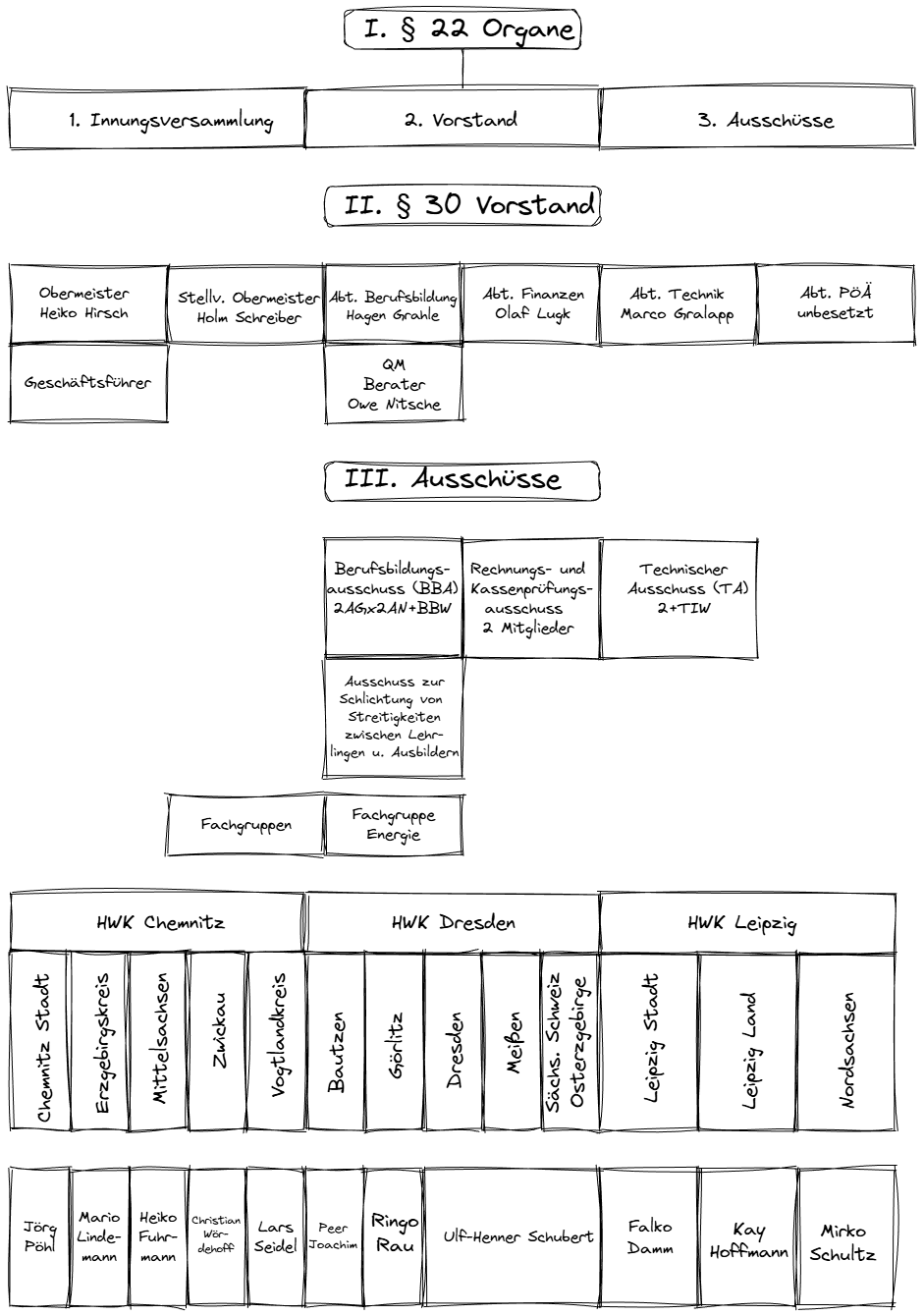 Hier sehen Sie die Organisation der Schornsteinfeger- Innung Sachsen gemäß der aktuellen Satzung. Die Vorstände und Ausschüsse der Innung wurden 2022 und 2024 zur Innungsversammlung für 5 Jahre gewählt. Die Kollegen verrichten die Tätigkeiten ehrenamtlich neben ihren eigentlichen beruflichen Verpflichtungen.